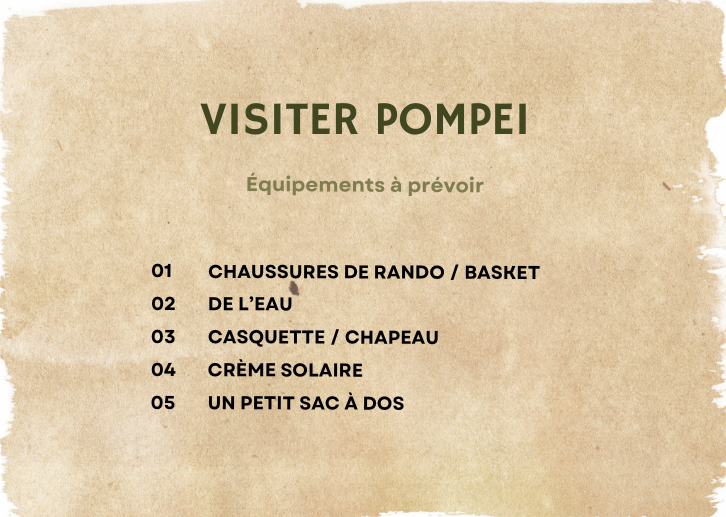 - Fontaines d'eau : plusieurs fontaines d'eau sont réparties dans tout le site. Apporte une gourde pour la remplir en chemin. les points d'eau : à côté dub temple d'Apollon, les thermes du Forum, dans la Via dell'Abbondanza, près de la Villa des Mystères.