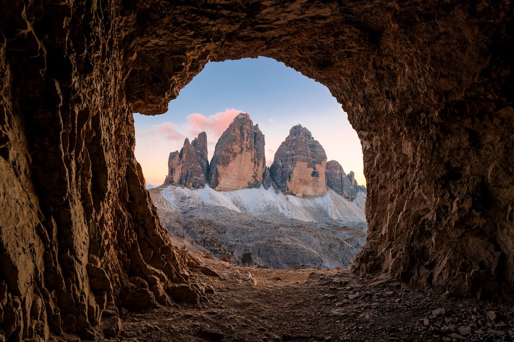 Après avoir atteint la Forcella Lavaredo, il suffit de continuer quelques dizaines de mètres sur le même sentier en direction du Rifugio Locatelli. Sur la droite, légèrement au-dessus du chemin, se trouvent plusieurs cavités rocheuses et anciens tunnels creusés dans la dolomie. C’est dans l’une de ces ouvertures que se situe la Grotta delle Tre Cime, offrant le point de vue le plus emblématique sur les faces nord des Tre Cime di Lavaredo.