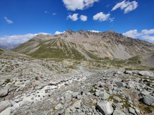 En sortant des alpages, le col se dessine au loin, derrière plusieurs verroux rocheux que vous remontez progressivement. La montée finale devient un peu plus raide à travers les schistes noirs, offrant une atmosphère austère mais spectaculaire qui marque la fin de l’ascension.