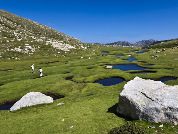Aujourd'hui, vous laissez derrière vous les crêtes escarpées et traversez un sentier ombragé en sous-bois, offrant un agréable contraste. En option, une variante vous permet de faire une randonnée à la découverte des mystérieux "Pozzi" du Renosu, un vaste plateau d’altitude incontournable. La journée se termine au gîte de Capanelle.