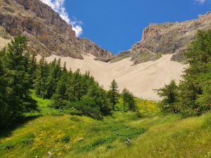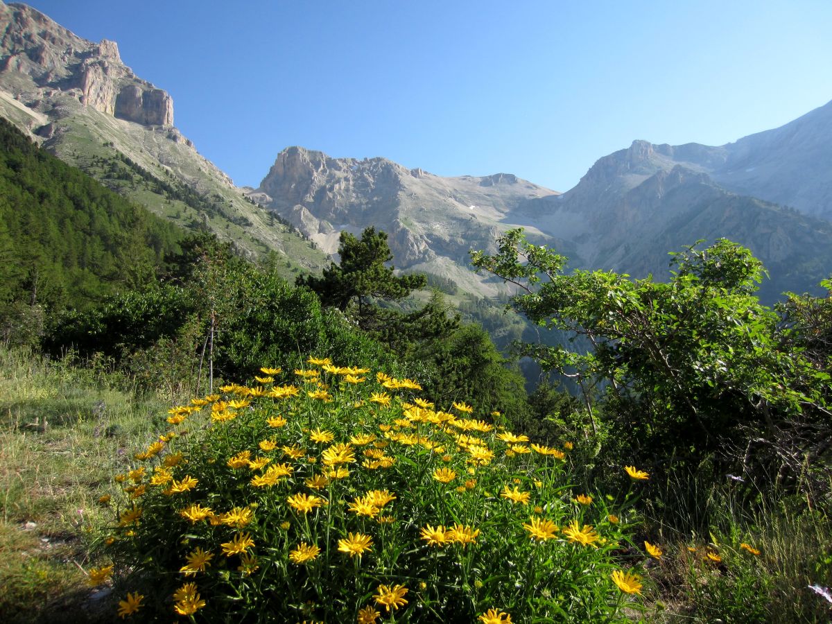 Le parcours alterne entre mélézins et alpages, puis longe le pilier de Bure, célèbre pour sa haute falaise calcaire. L’accès au village abandonné de Chaudun se fait ensuite par les gorges du Petit Buëch, connues pour leurs vasques claires.