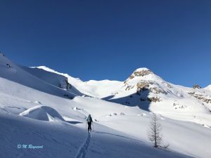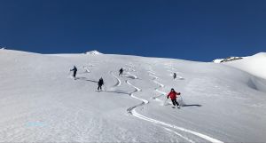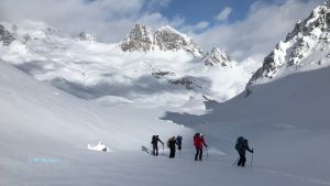 Pentes le plus souvent faciles et vastes. Possibilité d'évolution en terrain glaciaire très facile. Notions de ski de randonnée conseillées. Formation par le guide aux techniques de ski de rando.